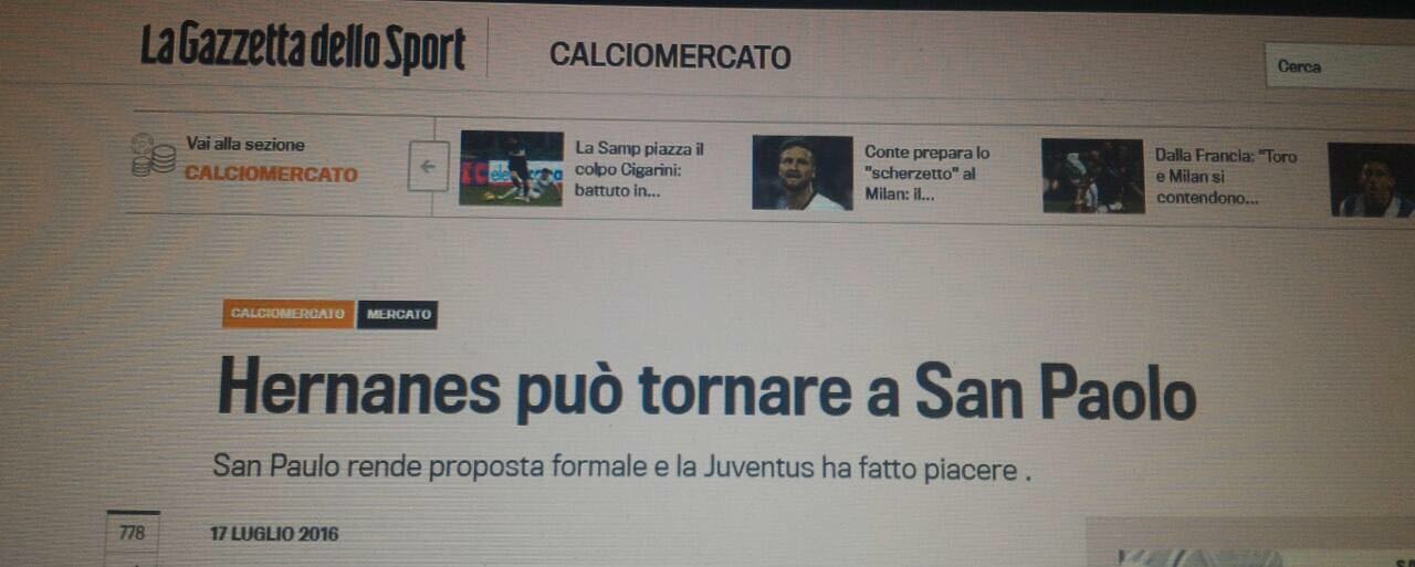 Boato: São Paulo faz oferta ao Juventus para ter Hernanes segundo "La Gazzeta delloSport"