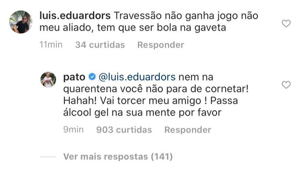 Um torcedor, no entanto, cornetou Pato no espaço reservado aos comentários do Instagram. O jogador do São Paulo, por sua vez, não perdoou a crítica mesmo com as competições todas suspensas: