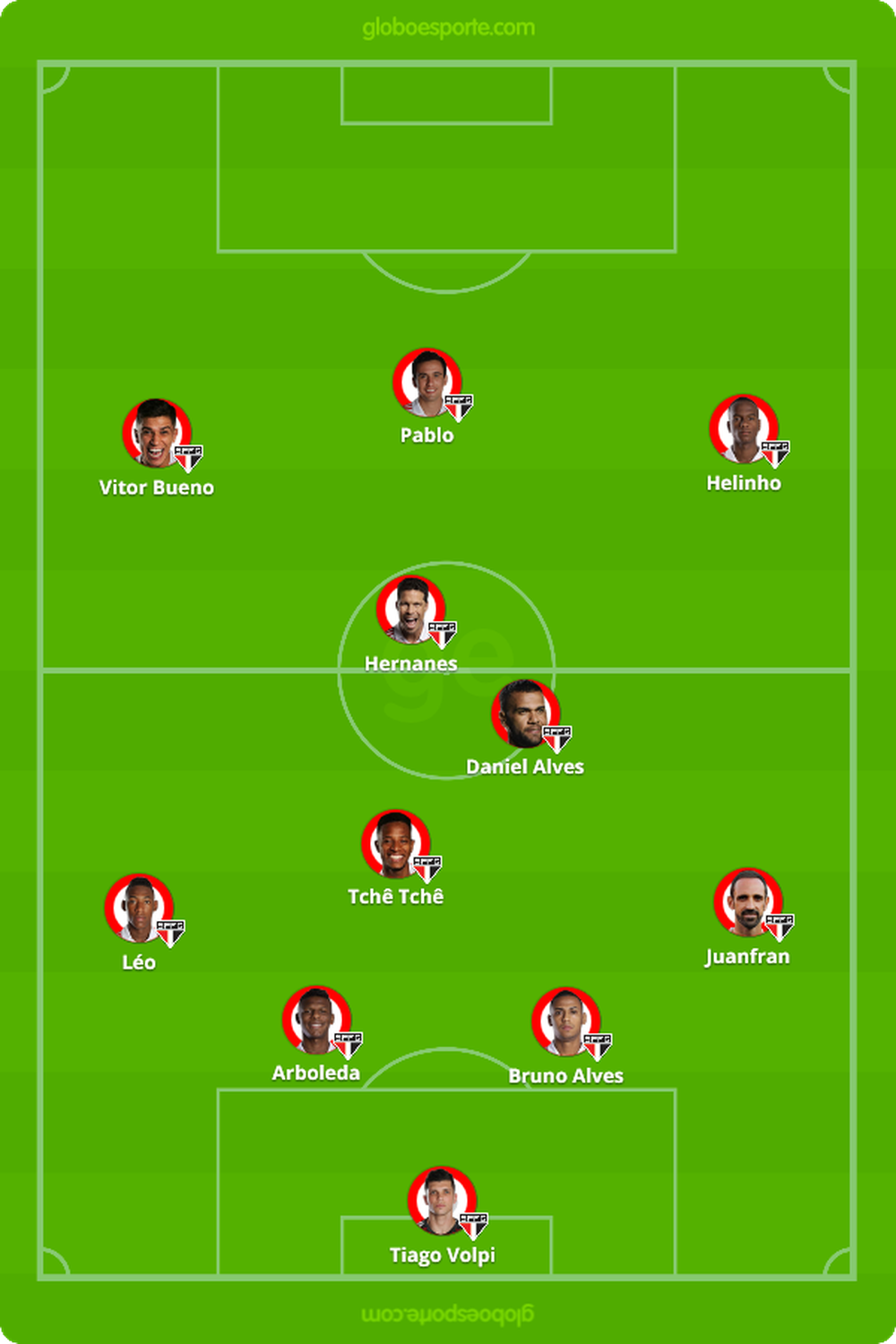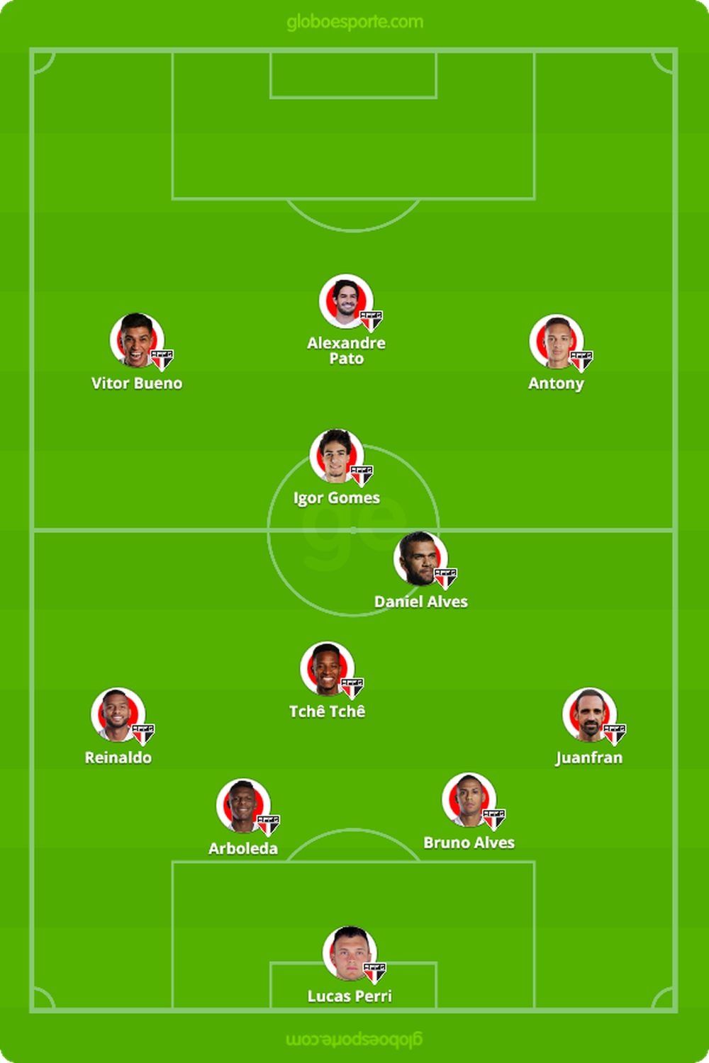 Escalação considerada ideal:Tiago Volpi, Juanfran, Bruno Alves, Arboleda e Reinaldo; Tchê Tchê, Daniel Alves e Igor Gomes; Vitor Bueno, Antony e Alexandre Pato.
