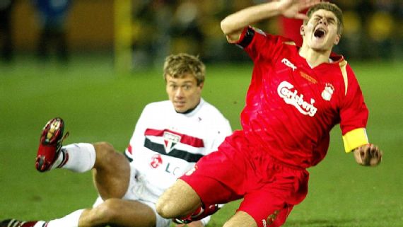 E, mesmo após 15 anos, todo torcedor tricolor se lembra de uma foto emblemática daquele jogo: o carrinho do zagueiro Diego Lugano no meia Steven Gerrard, então grande estrela dos Reds.
