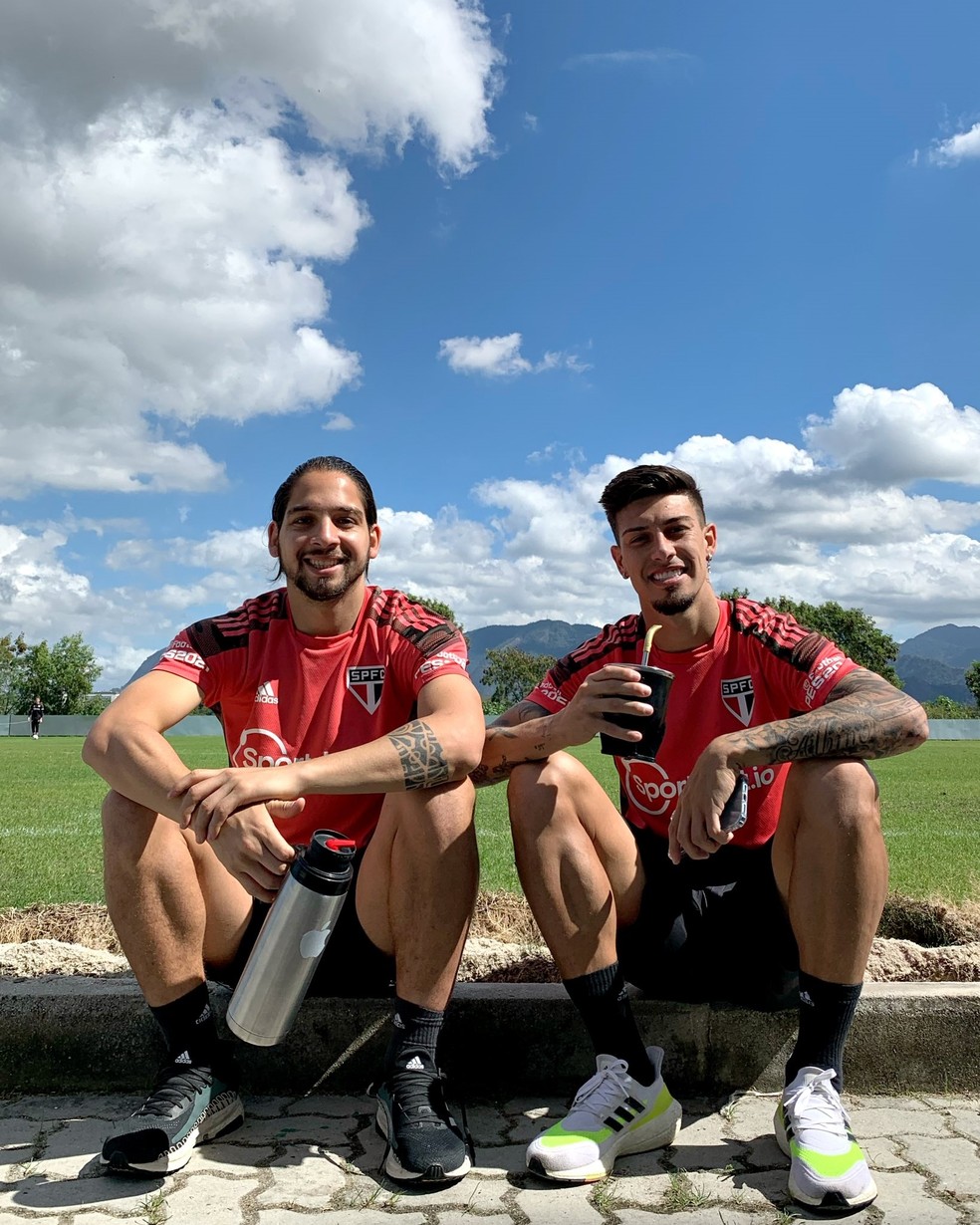 Benítez e Rigoni compartilhando um mate durante treino no Rio de Janeiro — Foto: Fellipe Lucena/saopaulofc