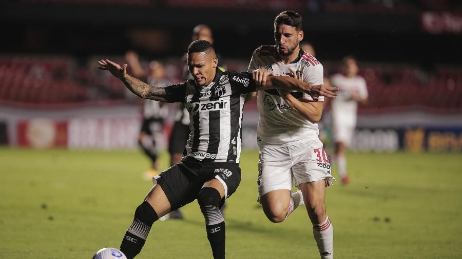Foi assim que Igor Gomes teve as duas melhores chances do São Paulo no primeiro tempo. Logo no primeiro minuto, o camisa 26 dominou na beirada da área e chutou para uma boa defesa de Richard. Aos 18 minutos, o meia ficou com a sobra de um cruzamento na área e acertou a trave do goleiro do Ceará.