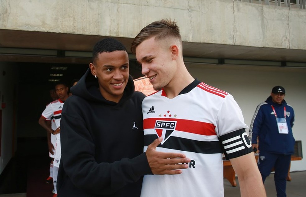 Fora da temporada 2022, o atacante Caio, de 18 anos e que já está integrado ao time profissional do São Paulo, foi a Cotia para acompanhar a goleada dos ex-companheiros.
