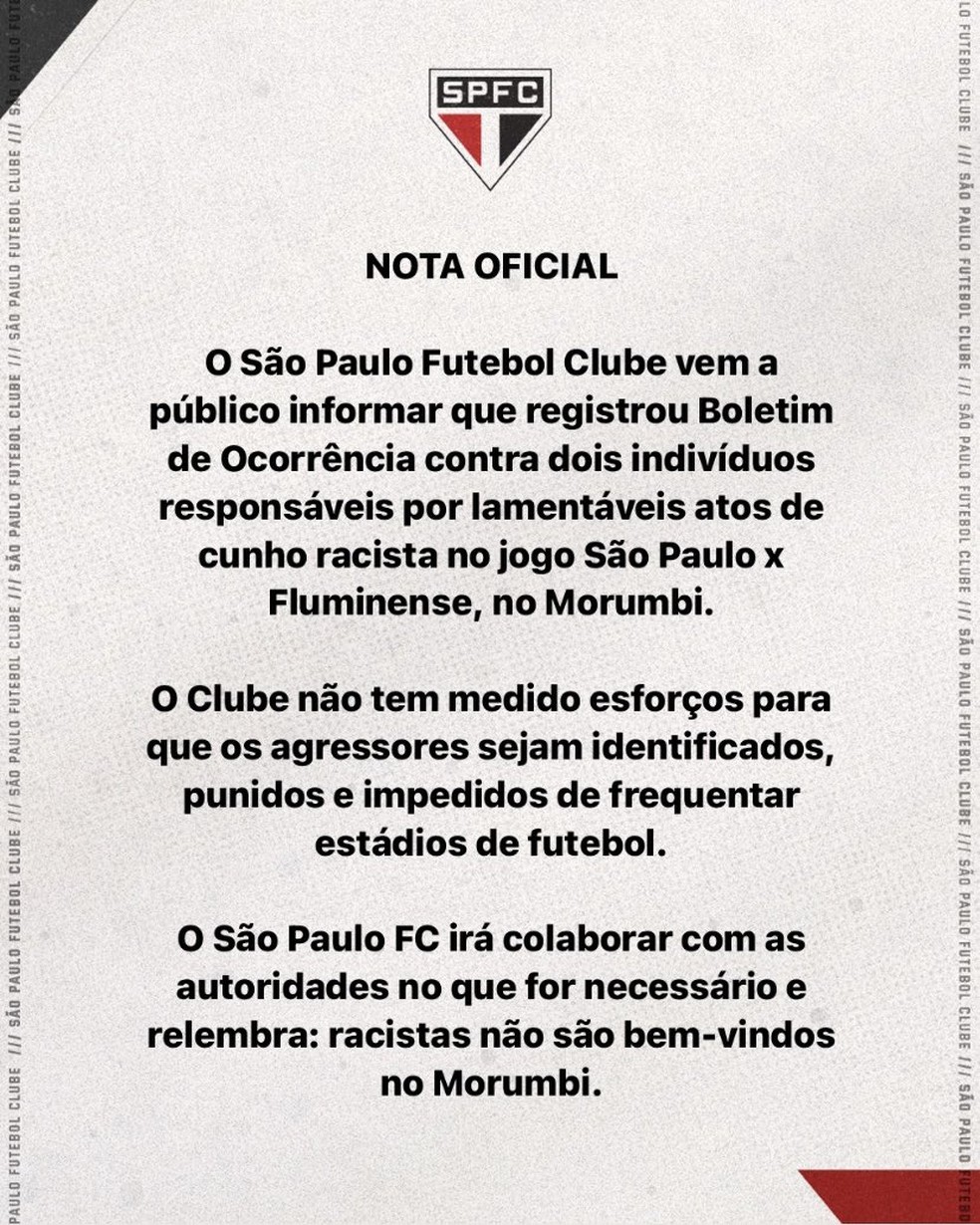 O clube paulista, mandante da partida, também repudiou o caso. “O São Paulo Futebol Clube lamenta as manifestações de racismo contra um torcedor do Fluminense ocorridas na partida desta tarde no Estádio do Morumbi e as repudia com veemência. O Tricolor reafirma que é contra todo tipo de discriminação, repudia qualquer forma de ofensa de cunho racial e se coloca à disposição das autoridades para apurar os fatos e ajudar a identificar o agressor. O São Paulo Futebol Clube é de todos, e no Morumbi não há espaço para racismo. Racistas não são bem-vindos”.