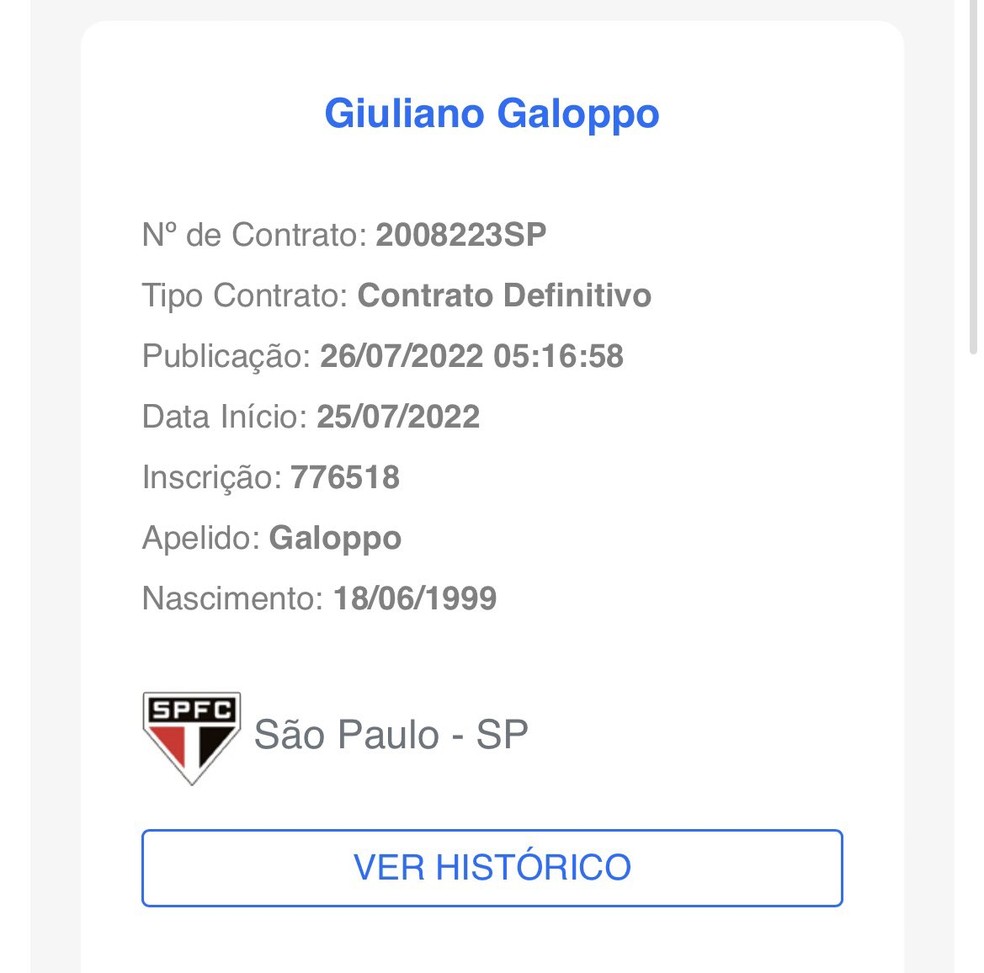 Galoppo é inscrito no BID pelo São Paulo — Foto: ReproduçãoAlém da Copa do Brasil, Giuliano Galoppo também poderá ser inscrito na Copa Sul-Americana. Isso porque ele só defendeu o Banfield na fase de grupos do torneio. O regulamento permite que um atleta atue por duas equipes diferentes uma vez que não seja na mesma fase da competição. O São Paulo está nas quartas de final.