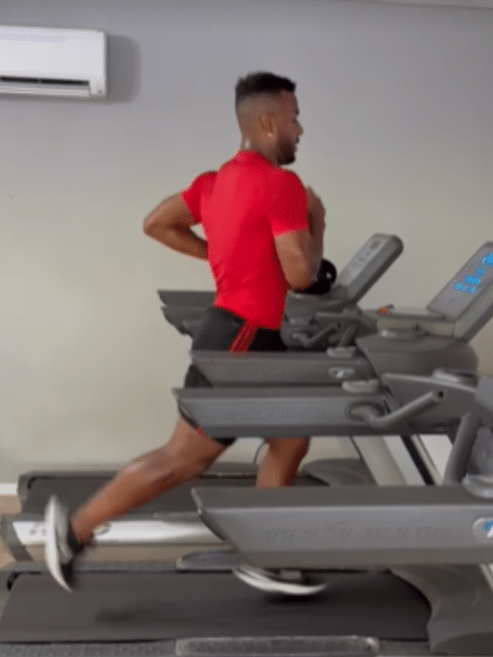 Luan aparece pedalando em uma bicicleta ergométrica e correndo em uma esteira nos registros compartilhados nas redes sociais