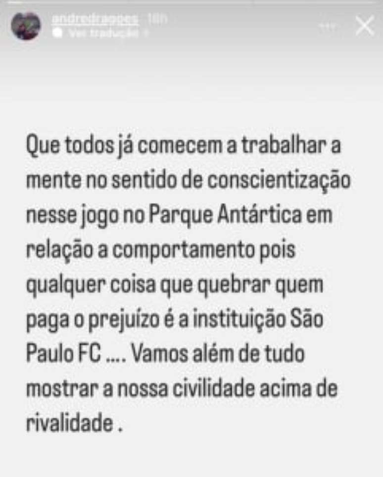A Dragões da Real seguiu na mesma linha, pedindo para que os torcedores presentes na decisão contra o Água Santa, que acontecerá nesta segunda-feira (13), evitem vandalismos, ressaltando que 'o São Paulo que terá que pagar por possíveis danos'. Além disso, o comunicado pediu 'civilidade e conscientização'.