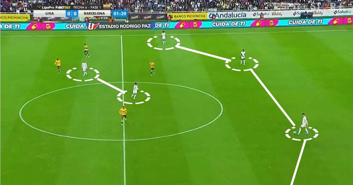 Vale destacar, no entanto, que até mesmo quando a jogada se desenrola bem pelos corredores, a equipe acaba finalizando o lance em um cruzamento, na tentativa de aproveitar os dois atacantes posicionados dentro da área. Assim, passes originados na intermediária, buscando os dois centroavantes, não são raros pela forma como joga a LDU.