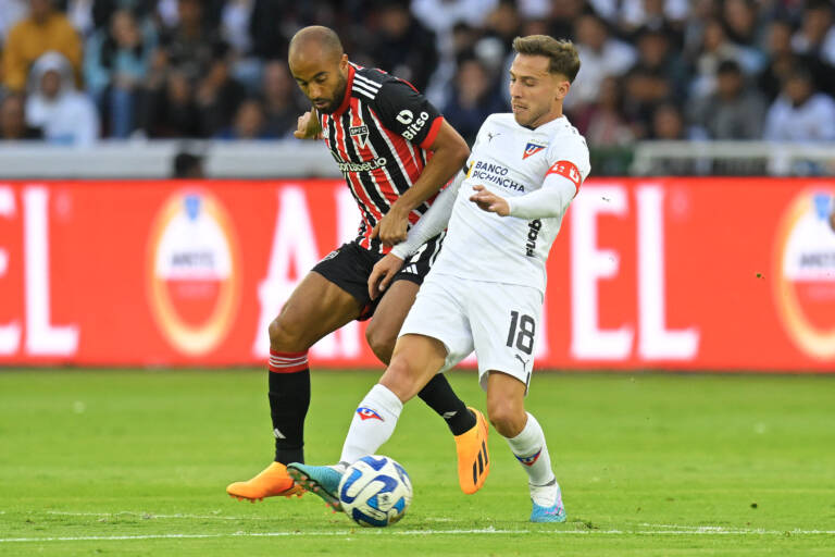 No primeiro embate entre os times, os equatorianos fizeram valer a altitude de mais de 2.850 metros acima do nível do mar e tiveram domínio do jogo, principalmente nos 45 minutos iniciais. Assim, chegaram a abrir 2 a 0 no placar, mas o gol de Lucas Moura, no segundo tempo, manteve o Tricolor completamente vivo no confronto.