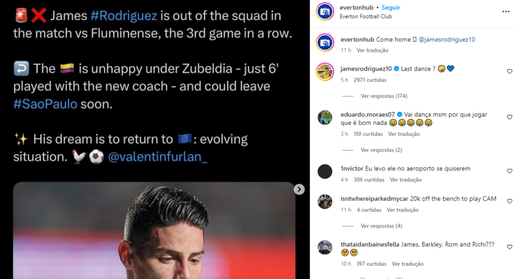 Na vitória contra o Fluminense, o meia James Rodríguez ficou de fora da lista de relacionados novamente. O colombiano, então, vive momento de indefinição da sua continuidade no São Paulo. Nesta terça-feira, o jogador, de 32 anos, comentou em uma publicação de torcedores do Everton, da Inglaterra, que pede o retorno dele ao time. "Last Dance? (última dança?)", escreveu. Em 26 jogos, James marcou seis gols e distribuiu oito assistências pelo clube inglês. Além da equipe, o meia soma passagens por Real Madrid, Porto, Bayern, Banfield, da Argentina, Mônaco, Olympiacos, da Grécia, e Al-Rayyan SC, do Catar, durante a carreira. Com futuro indefinido, James comentou em publicação que pediu a sua volta para o Everton. (Foto: Reprodução)