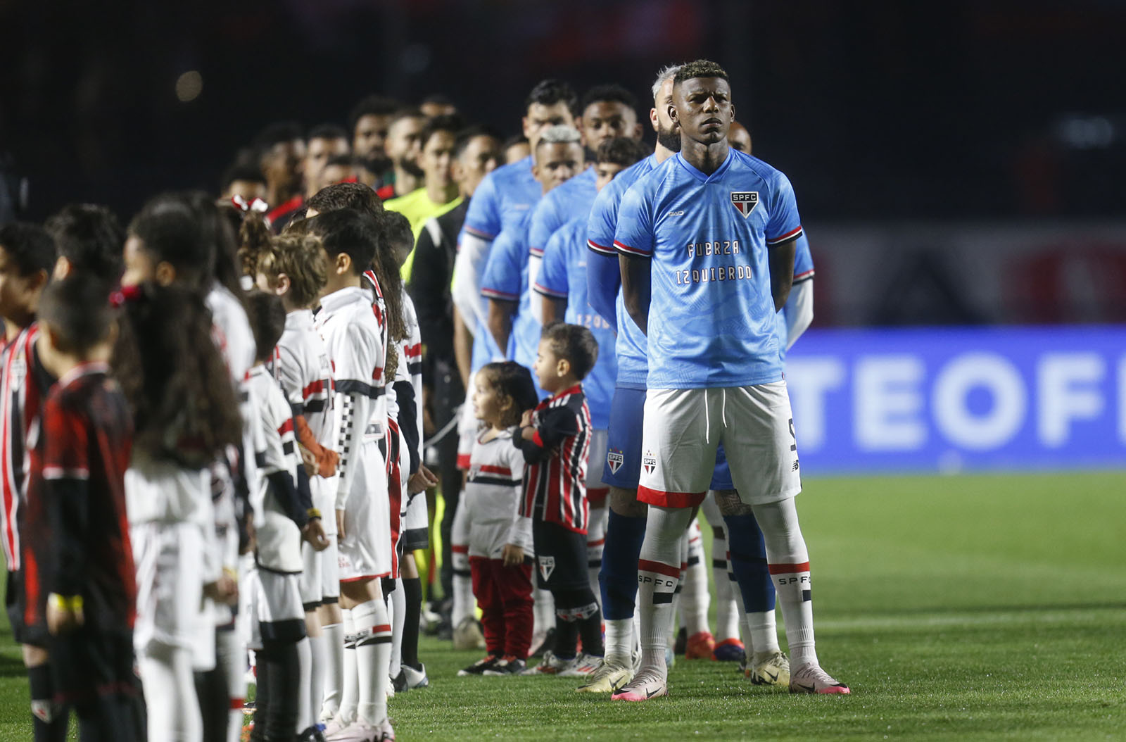 O time do São Paulo entrou no gramado do Morumbis neste domingo, antes do jogo diante do Vitória, com uma camisa azul em solidariedade a Juan Izquierdo , que segue internado na UTI do Hospital Albert Einstein. Todos os jogadores da equipe tricolor subiram a campo com uma camisa escrito: "Fuerza Izquierdo". Na tradução ao português, "Força Izquierdo". Momentos antes da bola rolar, inclusive, o Einstein divulgou um novo boletim médico e atualizou o quadro do atleta. Ele segue internado e foi submetido a novos exames neste domingo. A avaliação demonstrou progressão do comprometimento cerebral e aumento da pressão intracraniana. Juan, assim, segue sob cuidados intensivos neurológicos, dependente de ventilação mecânica. Izquierdo caiu desacordado aos 34 minutos do segundo tempo do jogo entre Nacional e São Paulo, pela Libertadores, na última quinta-feira, no Morumbis. Ele recebeu atendimento no estádio e precisou deixar o local de ambulância. Ao chegar no hospital, o zagueiro de 27 anos foi diagnosticado com uma arritmia cardíaca. Desde então, ele continua internado e seguirá em observação. Veja abaixo o boletim divulgado pelo Hospital Albert Einstein: "Internado desde o dia 22 de agosto de 2024, às 20h55, o paciente Juan Manuel Izquierdo foi submetido a novos exames neste domingo, 25. A avaliação demonstrou progressão do comprometimento cerebral e aumento da pressão intracraniana. Juan segue sob cuidados intensivos neurológicos, dependente de ventilação mecânica."