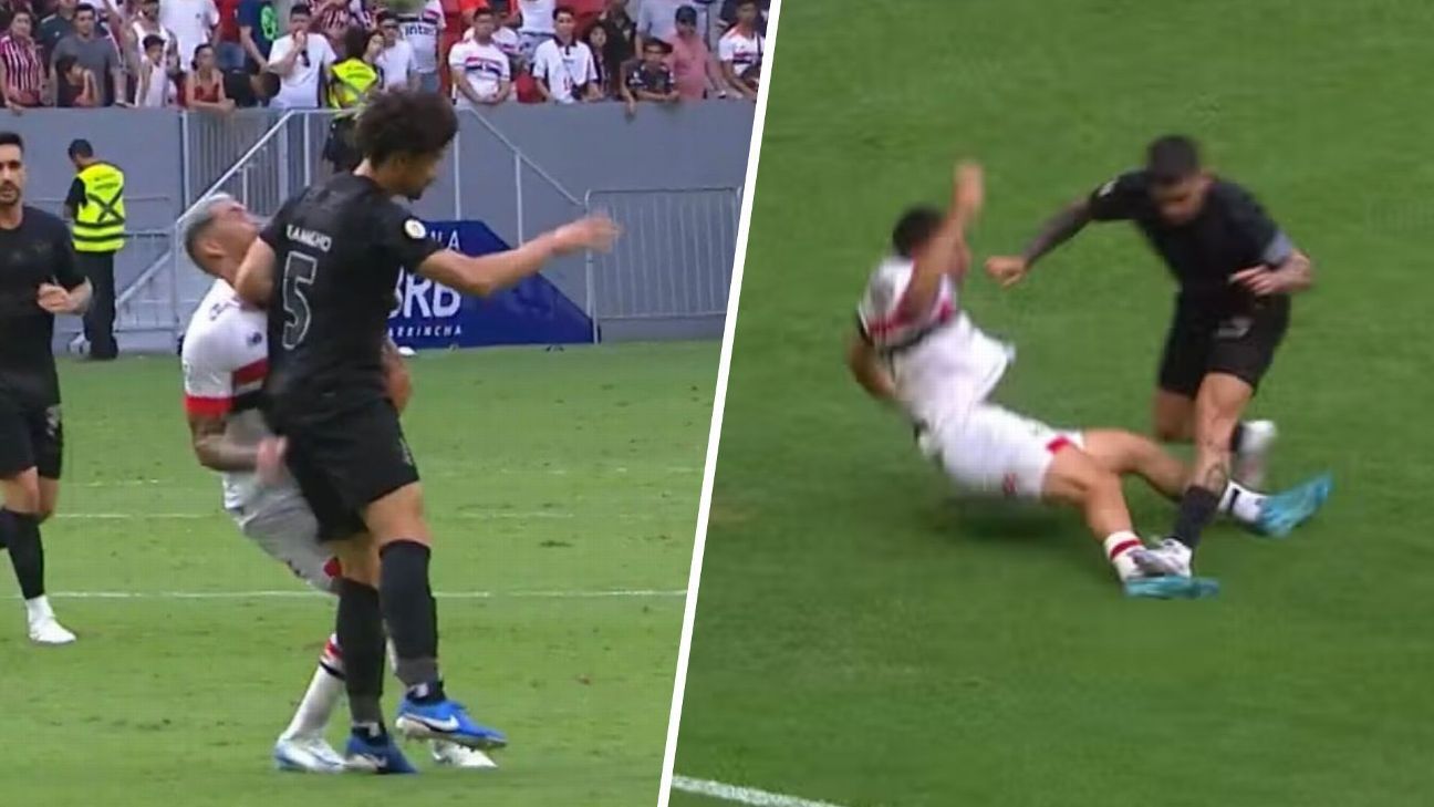 Depois, aos 17 do 2º tempo, Rafael Klein foi novamente chamado pelo VAR e expulsou André Ramalho por ter dado uma cotovelada no rosto de Luciano. ''Há golpe, há intesidade, atinge o adversário no rosto com o cotovelo. Não tenho dúvida que essa jogada é sim para cartão vermelho. A partir que a bola chega no Luciano, que dá aquele tapa na bola, com o árbitro tendo parado o jogo, aquele tapa do Luciano para longe era para deixar a bola longe, fazer de conta que estava dando um drible de efeito, e o André acabou perdendo a cabeça. Para mim, conduta violenta. Agrediu'', pontuou Gaciba. ''Conforme a regra, conduta violenta, ele age com brutalidade contra o adversário fora da disputa de bola. Expulsão correta. A regra ainda fala que atingir o rosto do adversário com o braço/mao sem disputa de bola é para expulsão, a não ser que a força seja insignificante. E a força pode não ter sido alta, mas não foi insignificante'', concordou Renata.