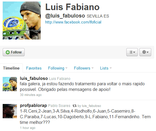 Hoje em seu Twitter o atacante se escalou no tricolor. O jogador de retweet (repetiu o tweet) de um torcedor que escalou a equipe do São Paulo com ele no ataque.