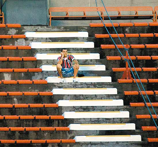 Um torcedor solitário do São Paulo na arquibancada; clubes mandantes perdem dinheiro no Paulista