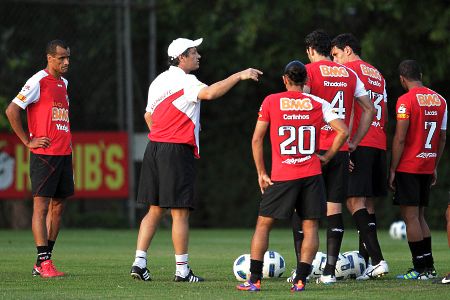 Rivaldo e Lucas ouvem as instruções de Adilson, que deve escalar os