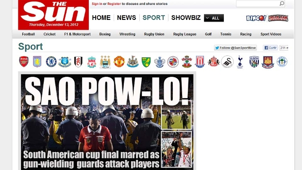 A confusão que aconteceu durante a final da Copa Sul-Americana entre São Paulo e Tigre, na última quarta-feira, no Morumbi, ganhou repercussão na Inglaterra. O tabloide 'The Sun' colocou em seu título os escritos Sao POW-lo, usando uma onomatopeia para descrever os incidentes no gramado e nos vestiários.