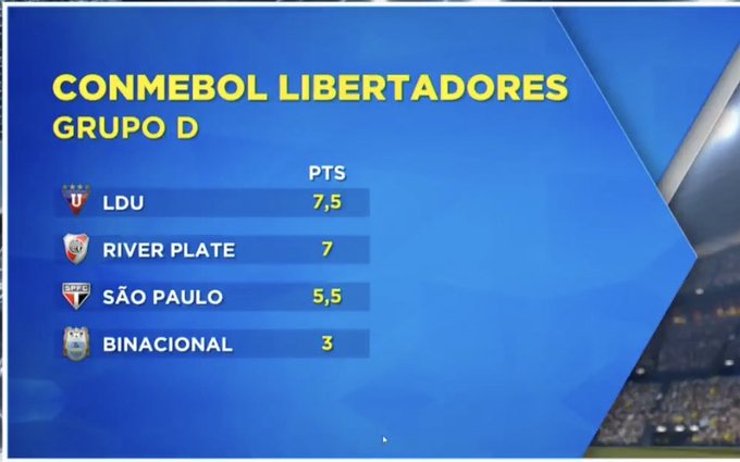 LDU está classificada, o S.Paulo não alcança mais a LDU. O River e S.Paulo disputarão a última vaga, o River com vantagem de 3 pontos a mais e 11 gols de saldo.