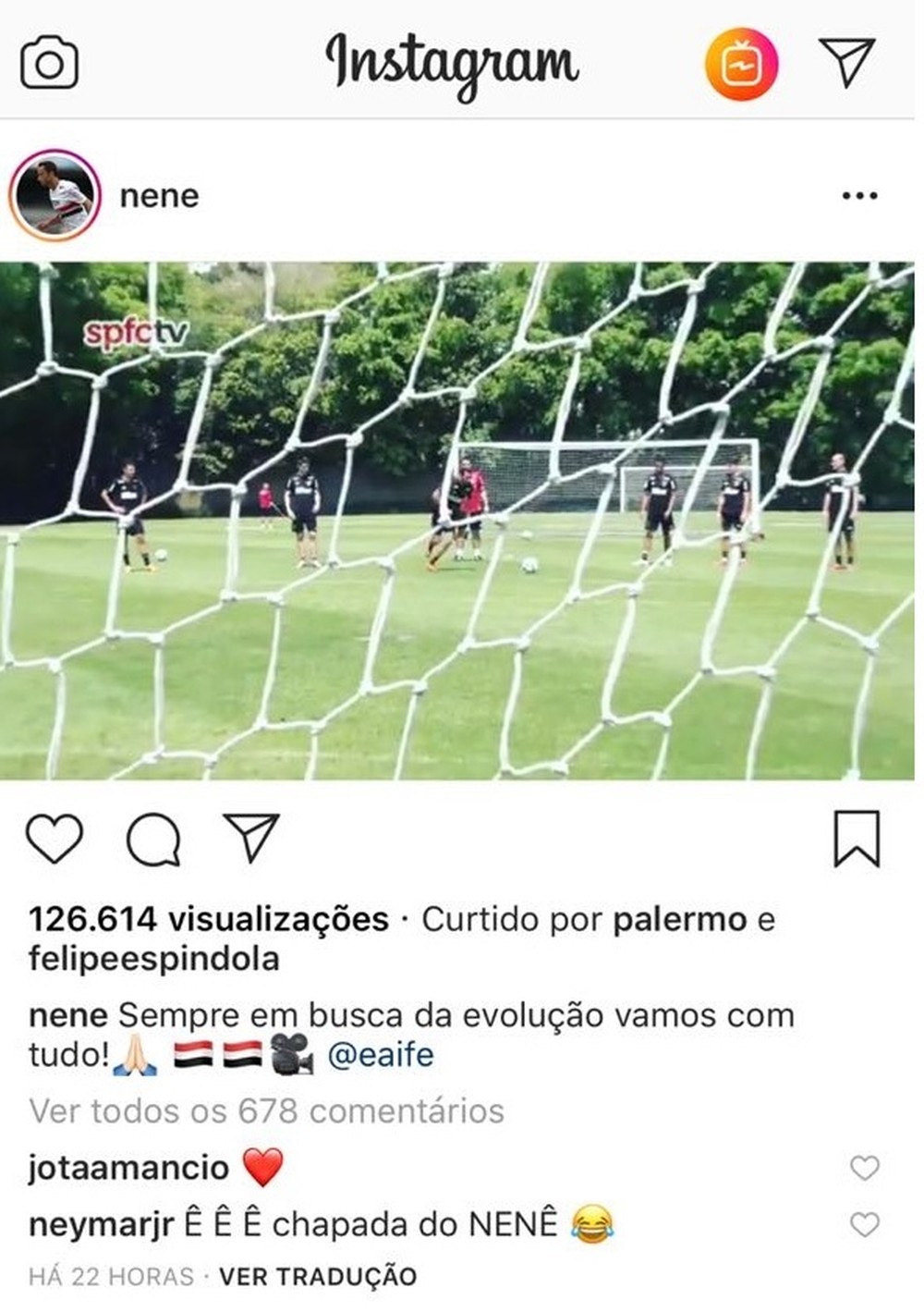 Neymar brincou com Nenê nas redes sociais. O camisa 10 do São Paulo publicou um vídeo com gols em um treino do Tricolor, no CT da Barra Funda, em que ele faz gols com a famosa "chapada" (veja abaixo).